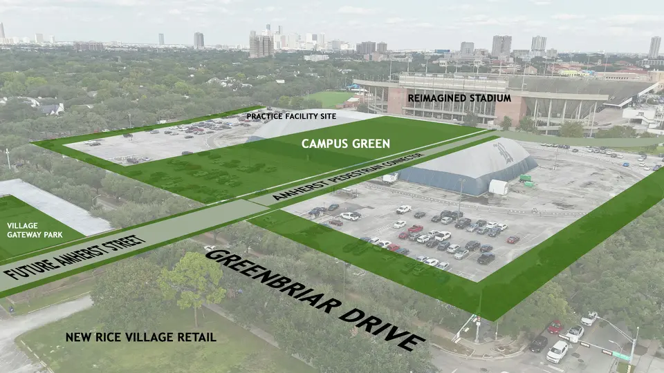 In addition to the stadium facelift, Rice will develop a new corridor to link campus with the pedestrian-friendly Rice Village. The corridor will extend Amherst Avenue two blocks east from Morningside Drive, through Chaucer Drive, until it reaches campus with a new entrance on Greenbriar Drive. It’s mostly an unused parking lot currently.